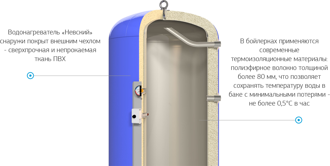 Водонагревательная емкость снаружи защищена слоем теплоизоляции и защитным кожухом. Современные термоизоляционные материалы, применяемые в бойлерах: полиуретан, пенопласт, минеральная вата — позволяют сохранять температуру воды в баке с минимальными потерями — не более 0,5 °С в час. В режиме сохранения воды на поддержание тепла будет расходоваться не более 1 кВт/ч в сутки.