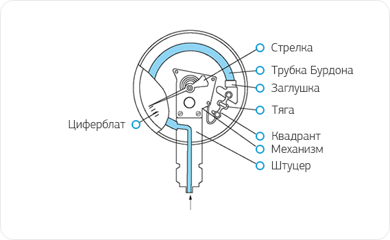 Для устранения мертвого хода между зубцами сектора и шестеренки служит спиральная пружина. Шкала проградуирована в единицах давления (паскаль или бар) и стрелка показывает непосредственную величину избыточного давления измеряемой среды. Механизм манометра помещен в корпус. Измеряемое давление поступает внутрь трубки, которая под действием этого давления стремится распрямиться, так как площадь наружной поверхности больше площади поверхности внутренней. Перемещение свободного конца трубки через передаточный механизм передается стрелке, которая поворачивается на определенный угол. Между измеряемым давлением и деформацией трубки существует прямолинейная зависимость и стрелка, отклоняясь относительно шкалы манометра, показывает величину давления.
