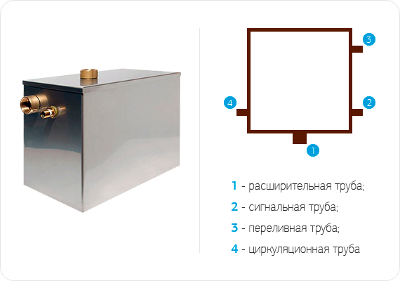 Кроме того, открытый расширительный бак предназначен для восполнения убыли объёма воды в системе при утечке и при понижении ее температуры, ограничения гидравлического давления в системе, сигнализации об уровне воды в системе, удаления воды в канализацию при переполнении системы, управления действием подпиточных приборов и, наконец, в отдельных случаях он может служить воздухоотделителем и воздухоотводчиком