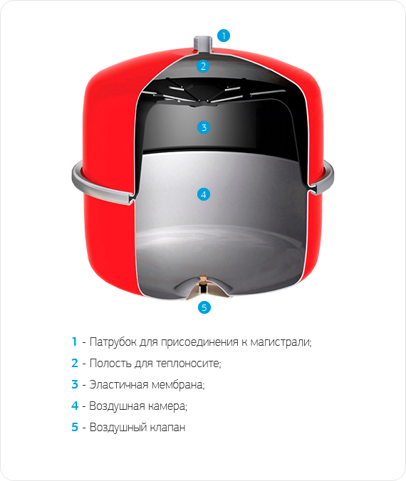 Конструкция мембранного расширительного бака представляет собой металлический корпус, который может быть плоского и баллонного типа, внутренний объем которого герметично разделен резиновой мембраной. В одной полости находится газ или воздух, сжатый до определенного начального давления, которое указывается в паспорте, за счет чего в неподключенном состоянии весь объем расширительного бака занят воздухом. Перед пуском системы давление зарядки газа необходимо установить равным статическому давлению системы отопления.