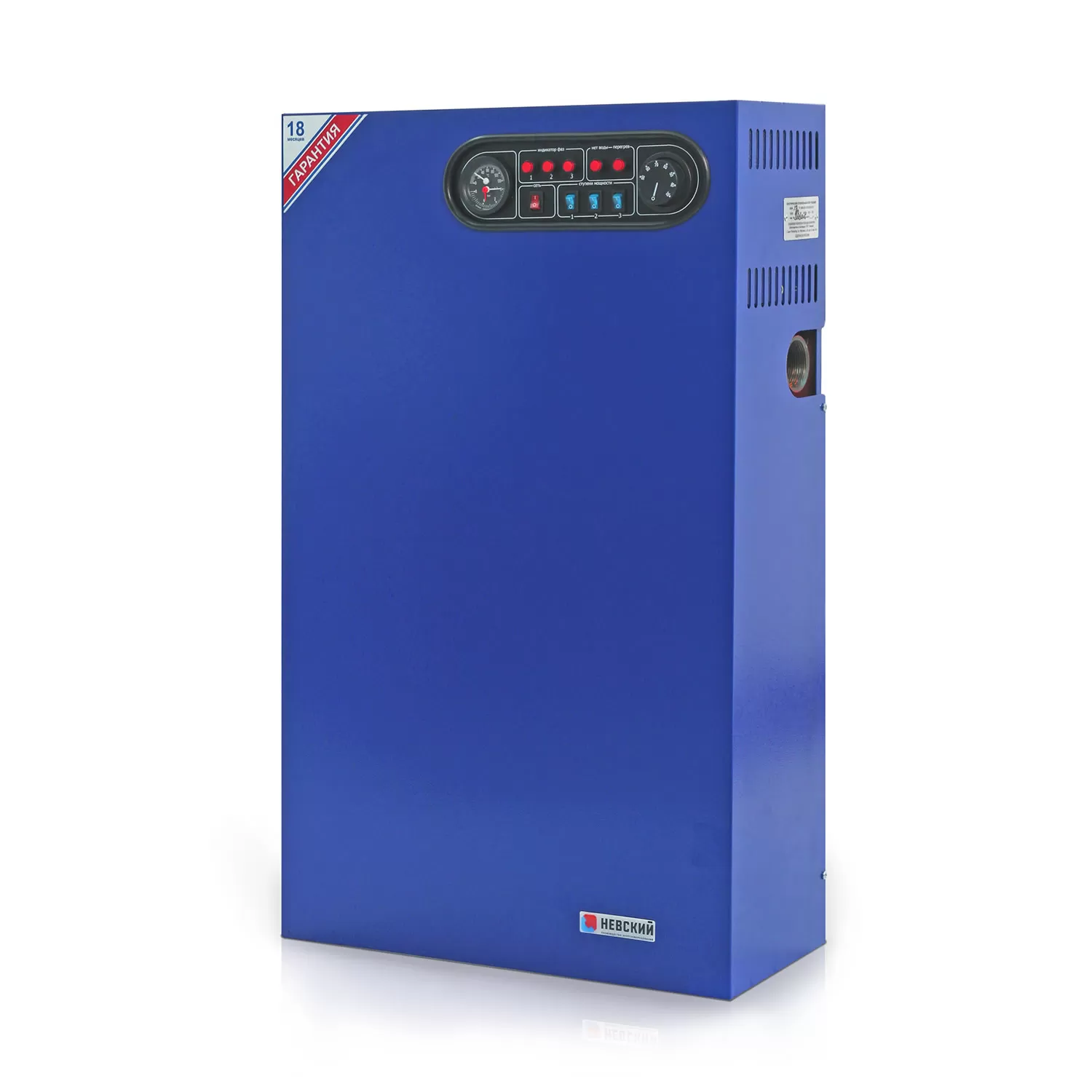 Монтируется на стене, занимает мало места и не требует отдельного помещения для размещения, имеет встроенный термоманометр. Котел имеет каскадное включение ступеней, контролирует наличие теплоносителя, входное напряжение, имеется возможность подключения дополнительного реле протока и термостата-программатора.