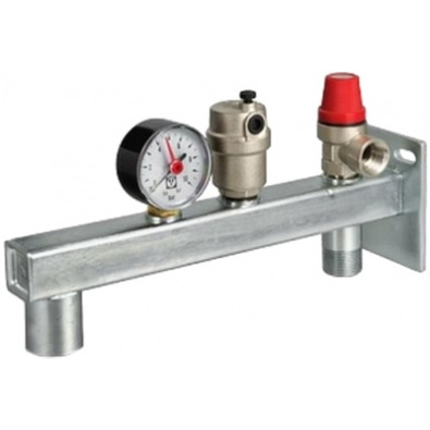 Группа безопасности котла VT-495 предназначена для защиты закрытых систем отопления от избыточного давления и завоздушивания. Включает в себя предохранительный клапан, автоматический воздухоотводчик (с запорным клапаном) и манометр, смонтированные на стальной консоли.