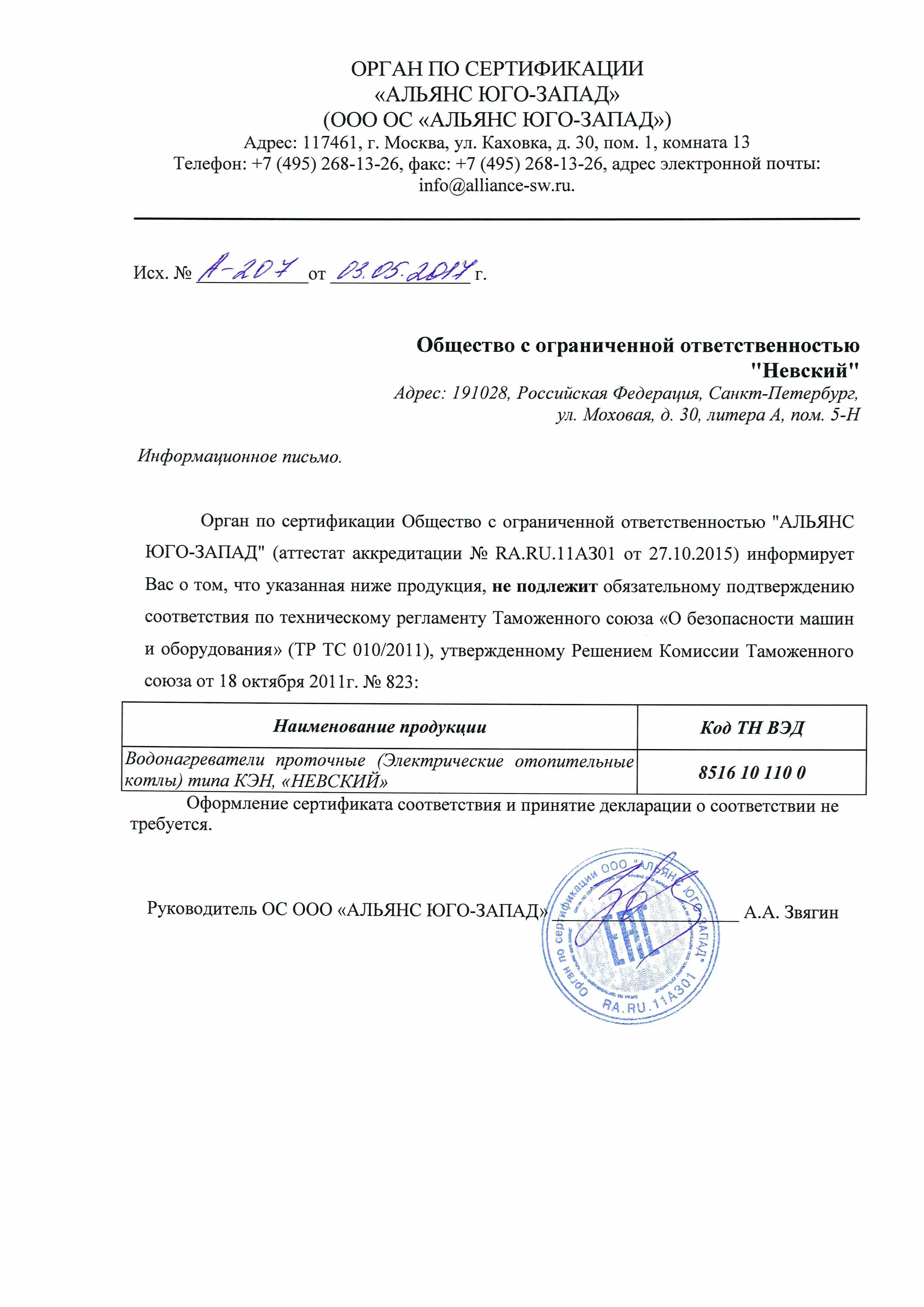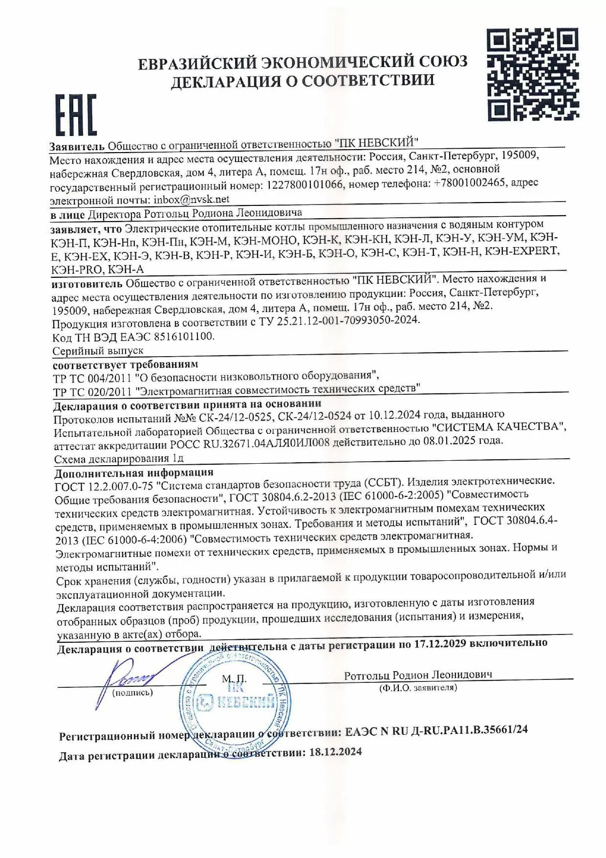 Сертификаты на промышленные электрокотлы «Невский» КЭН-П