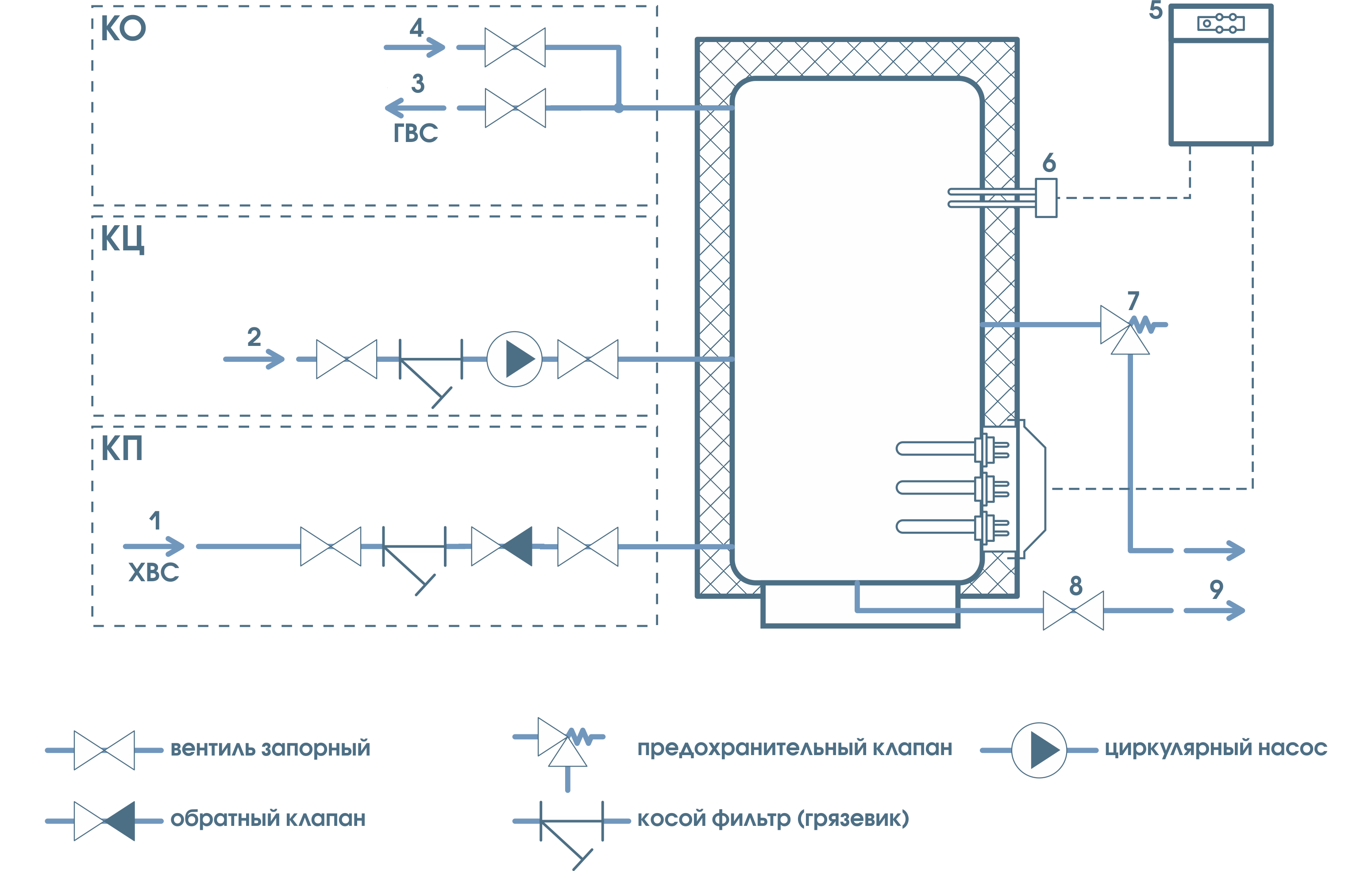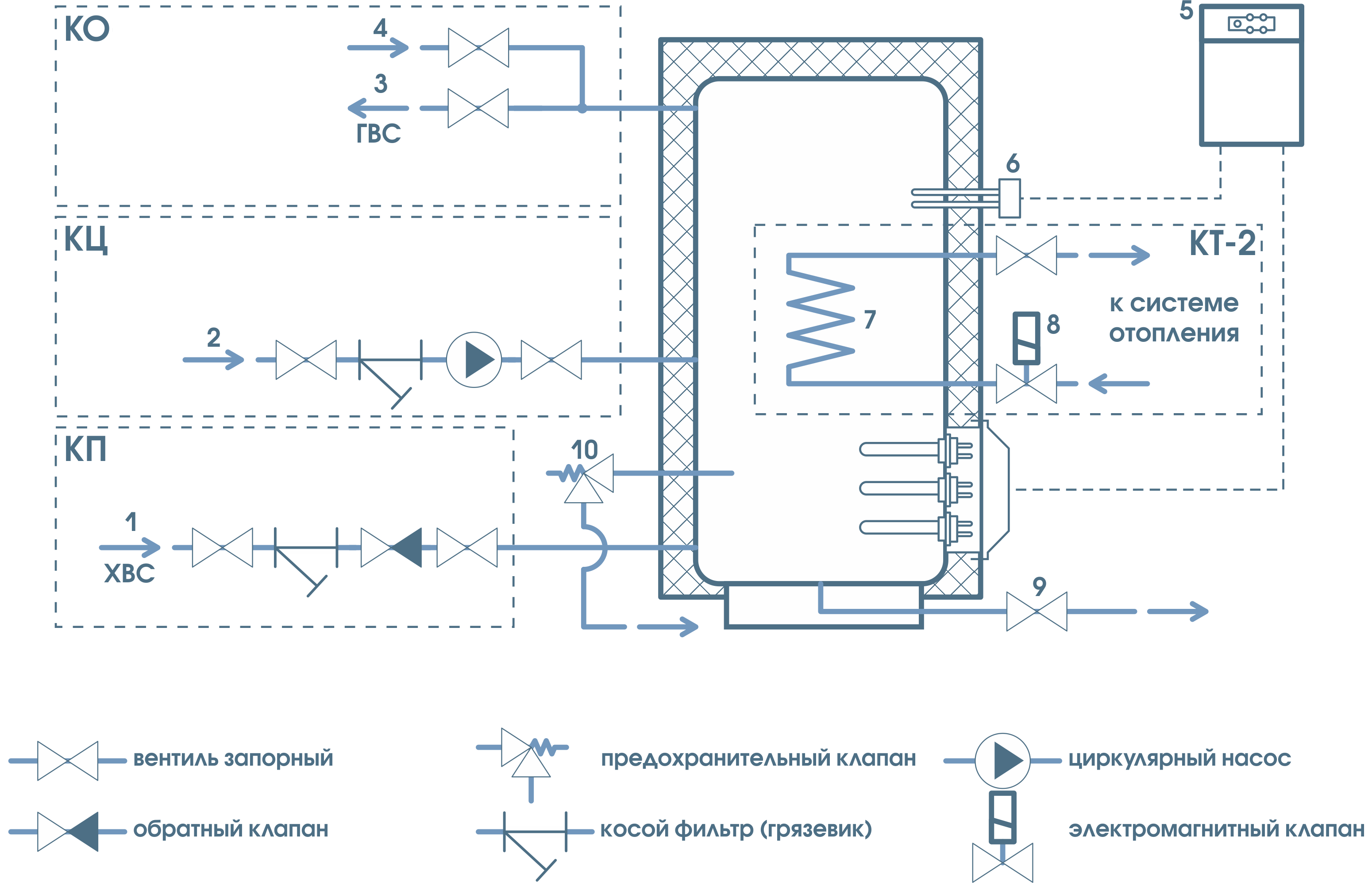 Нагрев воды в водонагревателе может производиться как от блока встроенных электротэнов, так и от теплообменника. Возможен комбинированный вариант. Каждый ТЭН 100 кВт имеет латунное основание и состоит из трех ТЭНов, изготовленных из нержавеющей стали AISI316L. Данная марка стали дает усиленную коррозионную стойкость, что увеличивает срок службы блок-ТЭНов 100 кВт.
