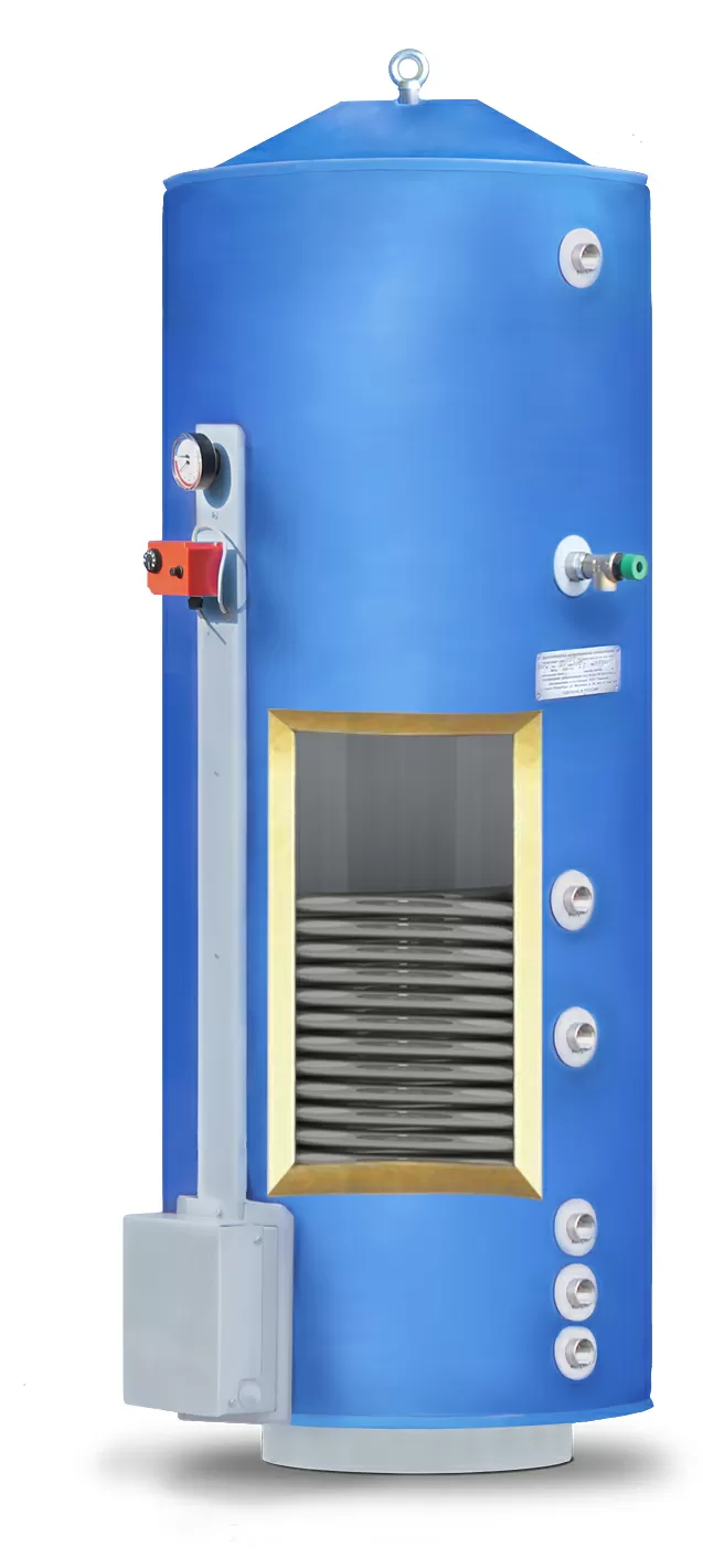 Встроенный трубчатый теплообменник 270 кВт представляет собой спираль из нержавеющей трубы, расположенную в нижней части бака. Он обеспечивает нагрев воды в баке водонагревателя горячим теплоносителем (водой или антифризом), проходящим через теплообменник. Регулирование температуры воды в водонагревателе осуществляется электромагнитным клапаном по сигналу от терморегулятора.