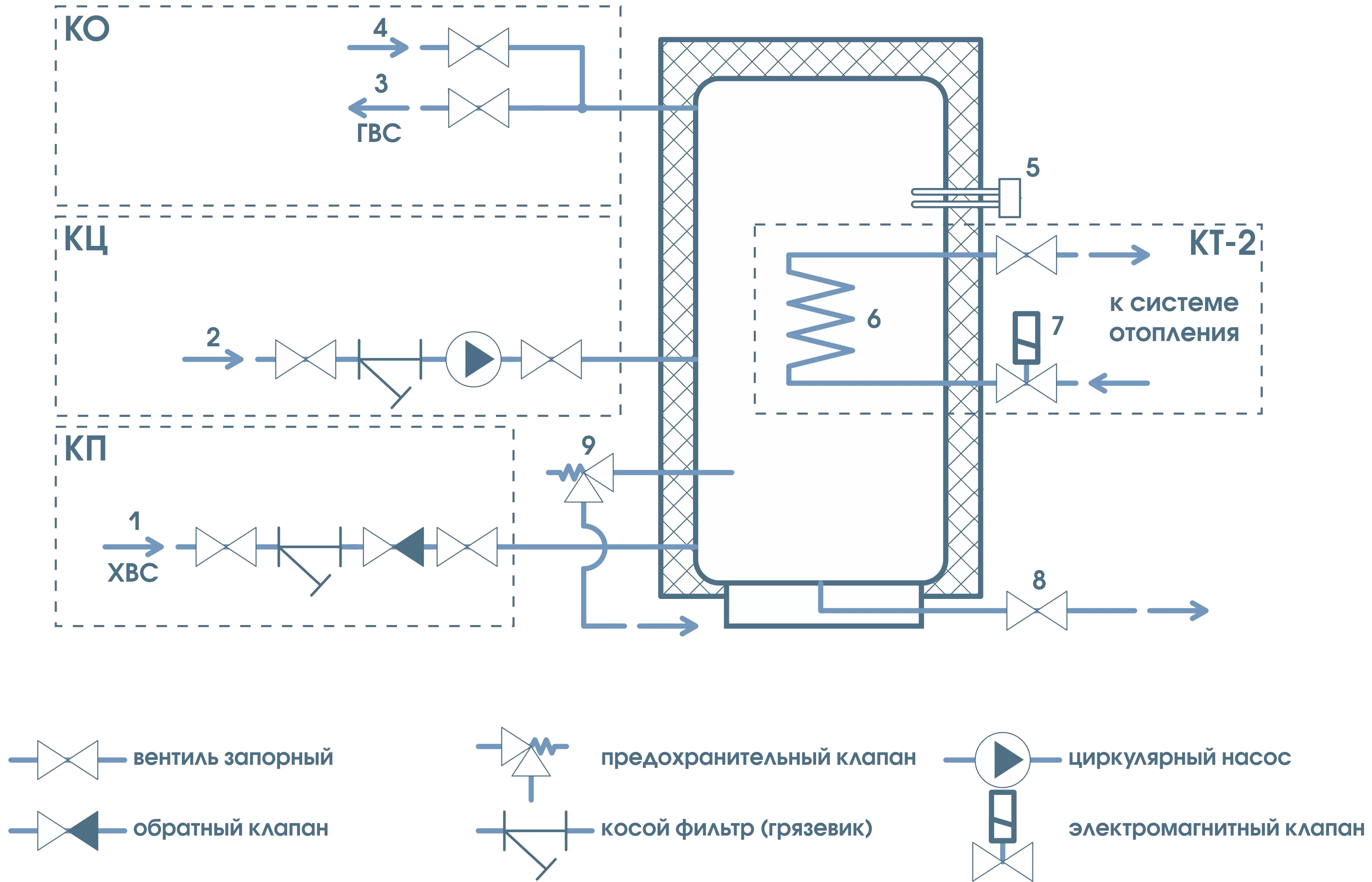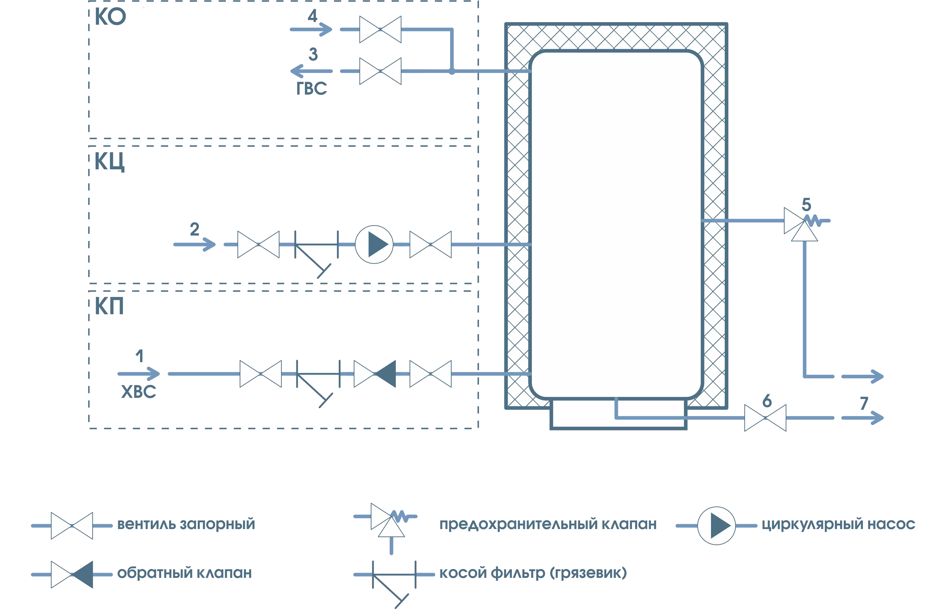 Водонагреватель вертикальный 8000 л. легко обеспечивает пиковые расходы системы горячего водоснабжения и может применяться совместно с другими источниками горячего водоснабжения в качестве основного или резервного. Теплообменник косвенного нагрева бойлера может быть выполнен, как в виде внешнего пластинчатого теплообменника, так и в виде встроенного змеевика из нержавеющей стали, теплоноситель в который подается от системы отопления здания.
